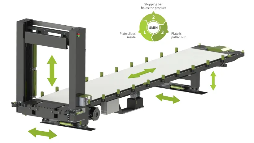 The stopper plate lowers to hold the load in place, enabling the sliding plate to retract.